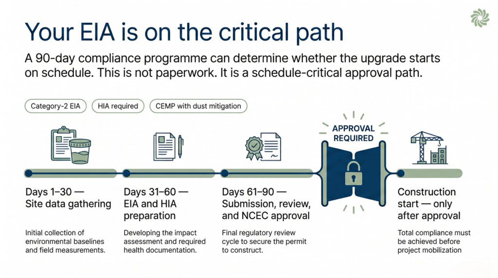 Four facilities. Ninety days. A Category-2 EIA that has to satisfy NCEC, align with SAEP-13, include a Health Impact Assessment, and land a Construction Environmental Management Plan with a dust mitigation component, all before a single upgrade to Dhahran, Qatif, or Al Hasa’s fire and oily water systems can begin.