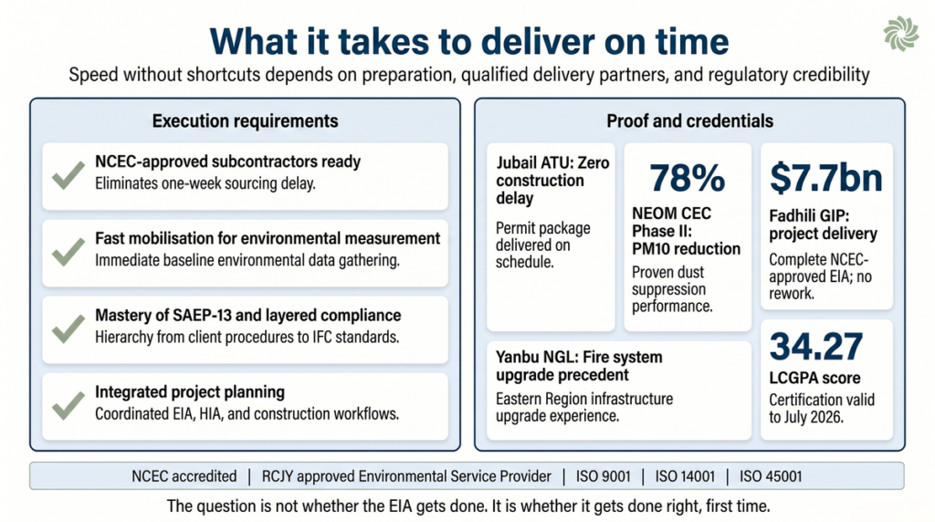 At the Jubail Advanced Treatment Unit expansion, we faced a comparable challenge: complex waste streams, noise impacts, groundwater sensitivity, and a client who could not afford regulatory delays. We delivered a complete Permit Application Package – waste management plan, noise propagation study, groundwater risk assessment, EERP, and EMMP – and secured the Environmental Permit to Construct with zero delays to the construction timeline.