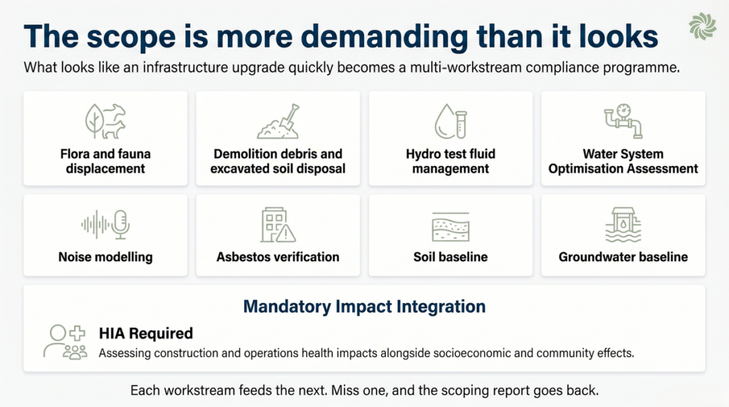 The EIA alone must cover flora and fauna displacement, demolition debris and excavated soil disposal, hydro test fluid management, a mandatory Water System Optimisation Assessment, occupational and equipment-generated noise modelling, asbestos verification across all new and replaced materials, and a full soil and groundwater baseline. Each workstream feeds into the next. Miss one, and your scoping report goes back.